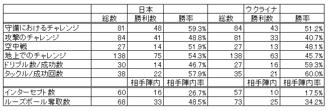 [DATA-3]を見れば分かるとおり、この試合の守備データは必ずしも悪くない。守備、攻撃、空中戦、地上でのチャレンジと、全てにおいて日本の勝率がウクライナに勝っていた。ドリブルの成功数やタックル成功数では多少負けていたが、わずかな差でしかない。