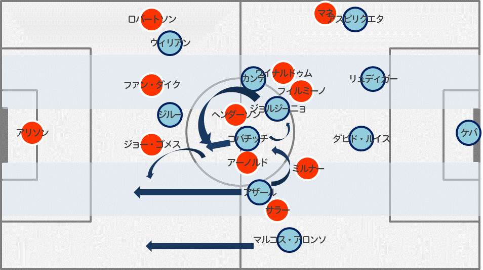 キーマンであるジョルジーニョに対し、リバプールMFジョーダン・ヘンダーソンが徹底的にマークしていたなかで、D・ルイスからボールを受けたアザールがワンタッチで反転したプレーや、コバチッチとジョルジーニョがパス交換でマーカーを剥がしたシーンは、今季のチェルシーが得意とする縦横の揺さぶりや緩急を最大限に活用した崩しと言える。