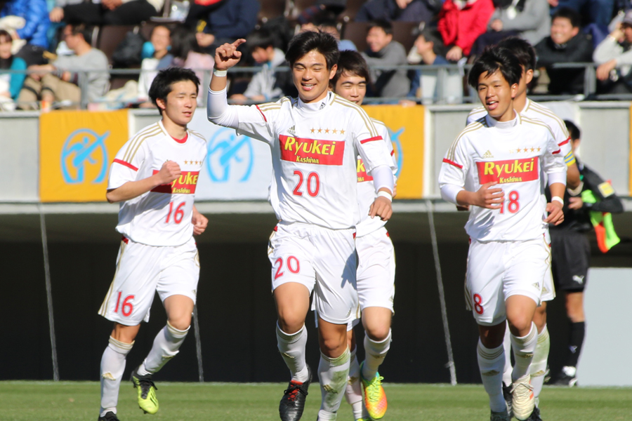 前回大会の準優勝校である流経大柏は、32年ぶりにベスト8入りを果たし勢いに乗る秋田商との一戦で、開始早々に大きな1点を奪う。前半6分、左サイドからMF熊澤和希がゴール前にロングスローを放り込むと、FW岡本竜がヘディングで合わせて相手守備陣がブロックしたところをMF八木滉史が押し込み、流経大柏が先手を取った。
