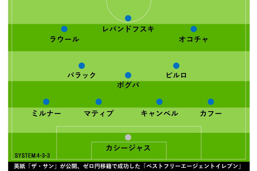 移籍市場が開くたびに注目を集めるのが、クラブとの契約満了により移籍金がかからずに獲得できる選手たちだ。英紙「ザ・サン」はこれまでにゼロ円移籍で成功を収めた選手たちで構成した「ベストフリーエージェントイレブン」を公開。世界屈指の点取り屋であるポーランド代表FWロベルト・レバンドフスキ(バイエルン・ミュンヘン)やイタリア最高のレジスタ、アンドレア・ピルロ(現ユベントス監督)ら豪華メンバーが顔を揃えた。