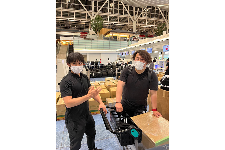 そして、その中にはアディダスジャパンの山根威信さんの姿も。日本代表のキットマネージャーを務める山根さんですが、F・マリノスの担当もしていただいています。この日は、届け物があるということで羽田にいらっしゃいましたが、数時間、荷物の確認に奔走する緒方くんのサポートをしてくれていました。