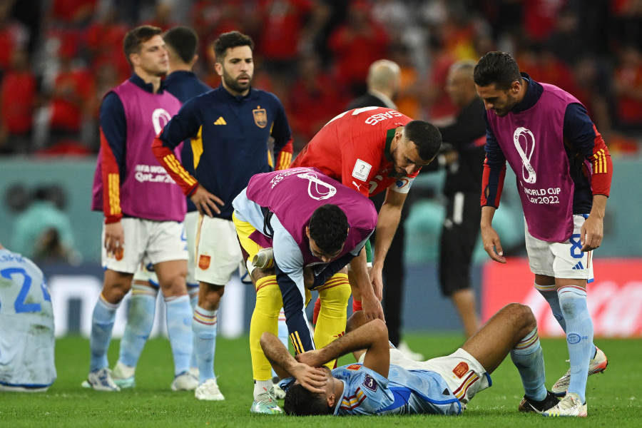 試合は互いに一歩も譲らない展開のなかPK戦へ突入。PK戦は先攻のモロッコが2人連続で成功させたのに対し、後攻のスペインは1人目のサラビア、2人目のMFカルロス・ソレール、3人目のMFセルヒオ・ブスケッツと立て続けに失敗。モロッコGKヤシン・ブヌが気迫の連続セーブを見せた。モロッコは4人目のハキミは、ゴール中央に度胸満点のパネンカを成功させ、PKスコア3-0でモロッコに軍配が上がった。