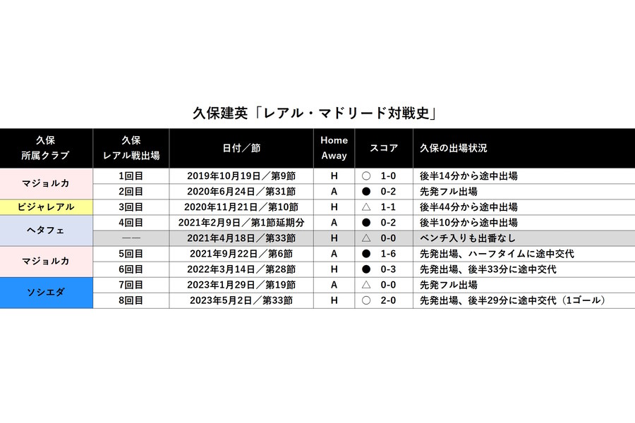 久保はこの4年間、マジョルカ、ビジャレアル、ヘタフェ、ソシエダに所属してレアル戦通算8試合に出場。その成績は2勝2分4敗、1得点0アシスト。フル出場は2回あった。