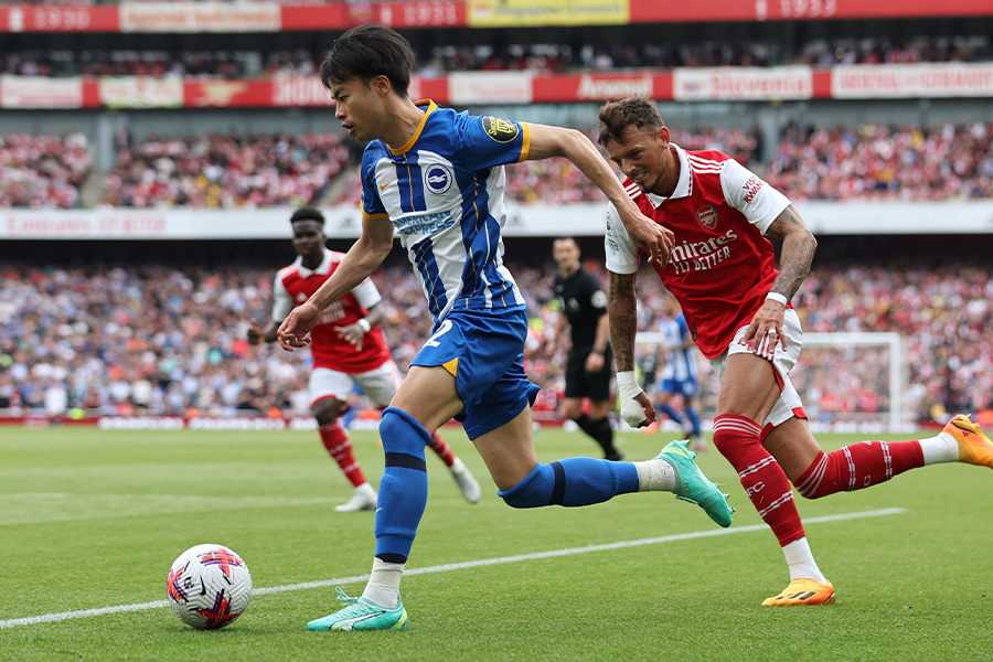 1対1で相手の右サイドバック(SB)と対峙してからゴールライン方向に鋭く切り返すと、一瞬にしてトップスピードに達し、相手を置き去りにして得意の右足アウトサイドでゴール前に危険極まりないクロスを送るといったプレーも披露する。サウサンプトン戦(ホーム/3-1)で見せた今季最後のアシストもこのパターン。こぼれ球をかっさらったかと思えば、相手のボランチを吹き飛ばしての完璧なクロスだった。イングランドのファンもしびれたでしょう。本当に豪快にして圧巻のアシストだった。とにかく、ボールを出せば無の状態からでもチャンスを作ってくれるんだから、三笘という選手そのものがブライトンのおいて立派な戦術になっていた。