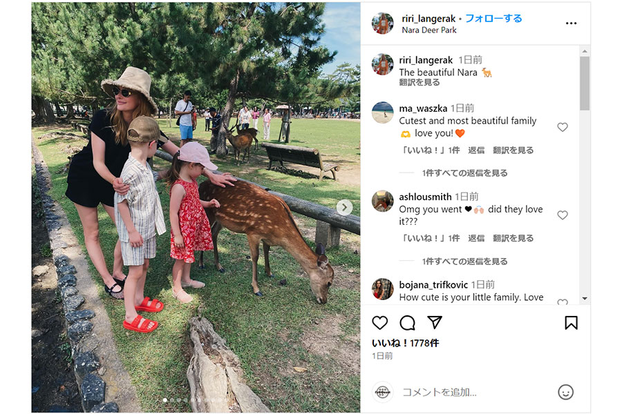 投稿には、ランゲラックや子供たちが鹿と戯れる様子もアップされており、「なんて美しい家族」「美しい写真」「奈良は最高」といったコメントが寄せられていた。