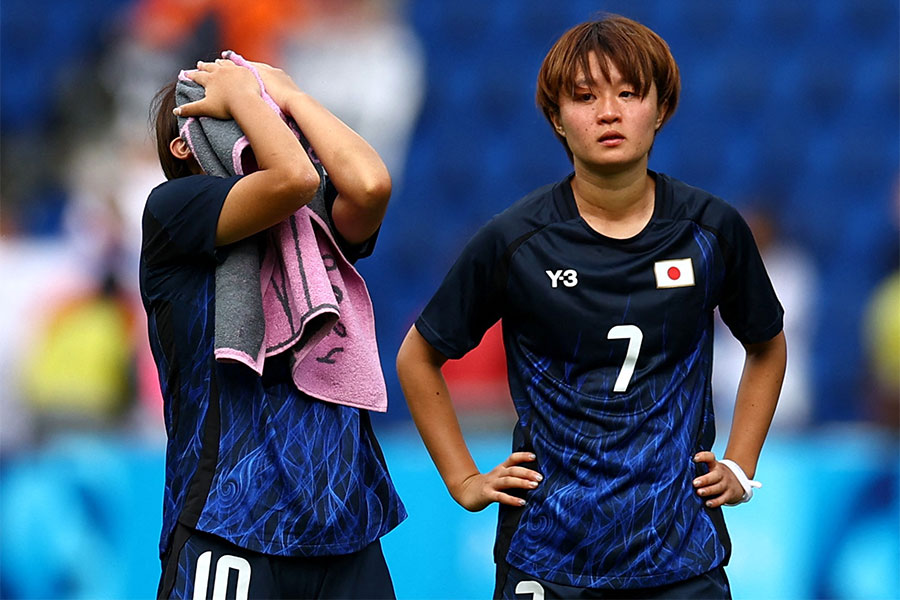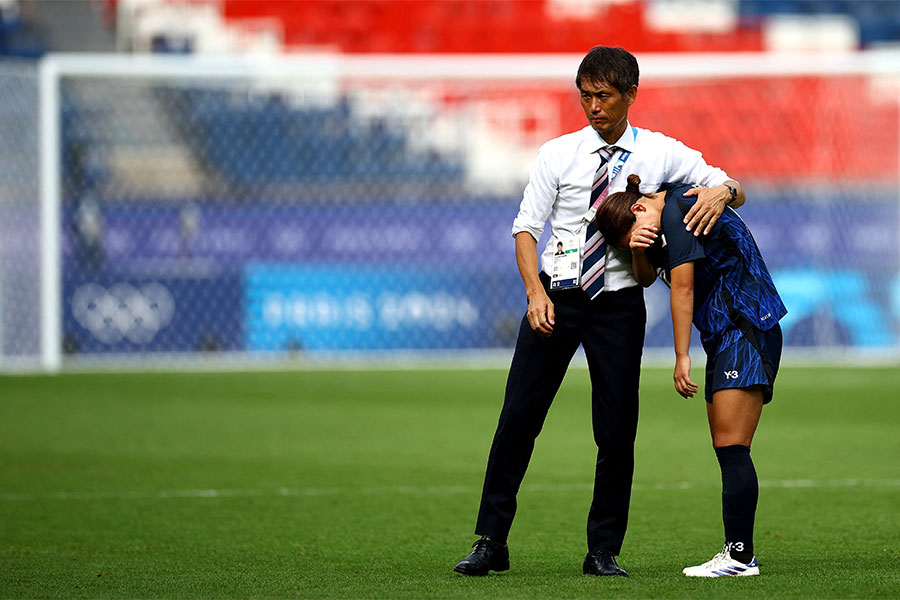 パリ五輪の女子サッカー競技は現地時間8月3日に準々決勝が行われ、なでしこジャパン(日本女子代表)がアメリカに延長戦の末、0-1で敗れた。試合後、涙する選手たち。背番号10のMF長野風花の元には池田太監督が駆け寄り、励ましていた。2人の関係性は大きな話題となっている。
