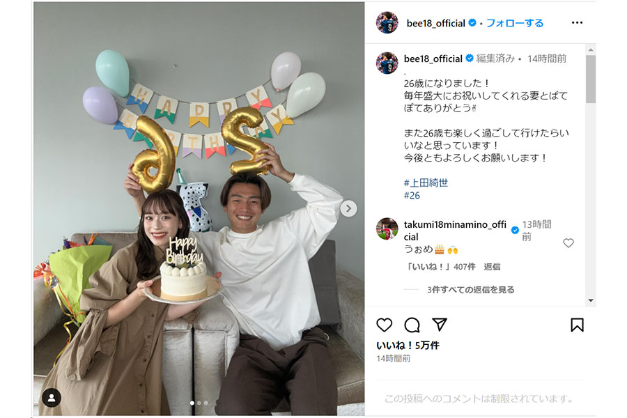 コメント欄ではファン・サポーターから祝福が殺到。「かわいい家族」「上田夫妻見てると癒されます」「素敵な写真」「理想とする夫婦」「最強にかわいい夫婦」など、反響の声も寄せられた。