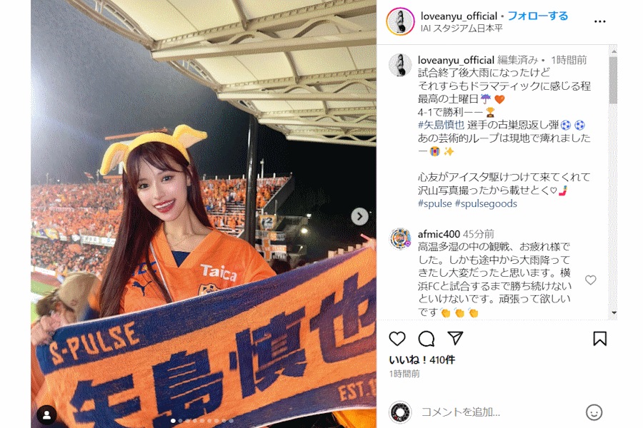 広瀬さんは清水のユニフォーム姿で、矢島の推しタオルを持った写真などをアップ。投稿には、ファンから「勝利の女神」「可愛すぎる~」といった声が上がっていた。