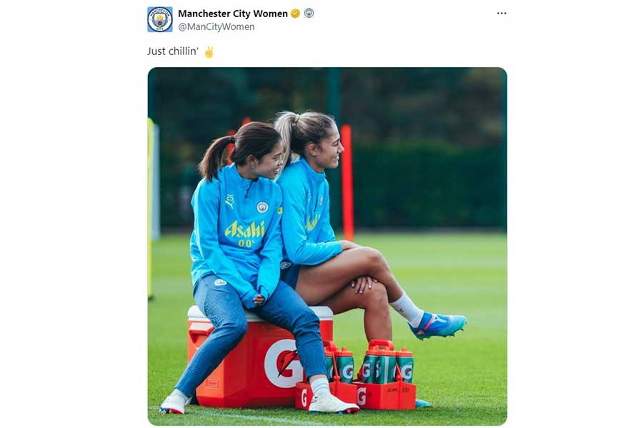 イングランドのマンチェスター・シティが公式SNSを更新。「ほっと一息」と綴り、女子チームに所属するなでしこジャパン(日本女子代表)MF長谷川唯が同僚と練習中にくつろぐ様子を公開するとファンからは「ピアス?!可愛い」「2人似てる」と話題を呼んでいる。