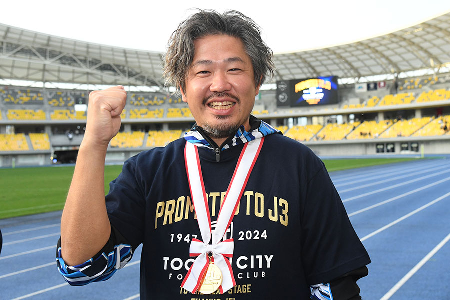 関東リーグからJFLに上がり、1年でのJ3昇格。一気に目標の「Jクラブ」となったが、ここまでの道のりは決して順風ではなかった。昇格決定後、真っ先に胴上げされたのは「いつかJへ」と言い続けてきた大栗崇司社長(41)。「いつか、に日付を入れてくれたのは、今日集まってくれた9531人です」とスタンドの観客に感謝しながら涙が止まらなかった。