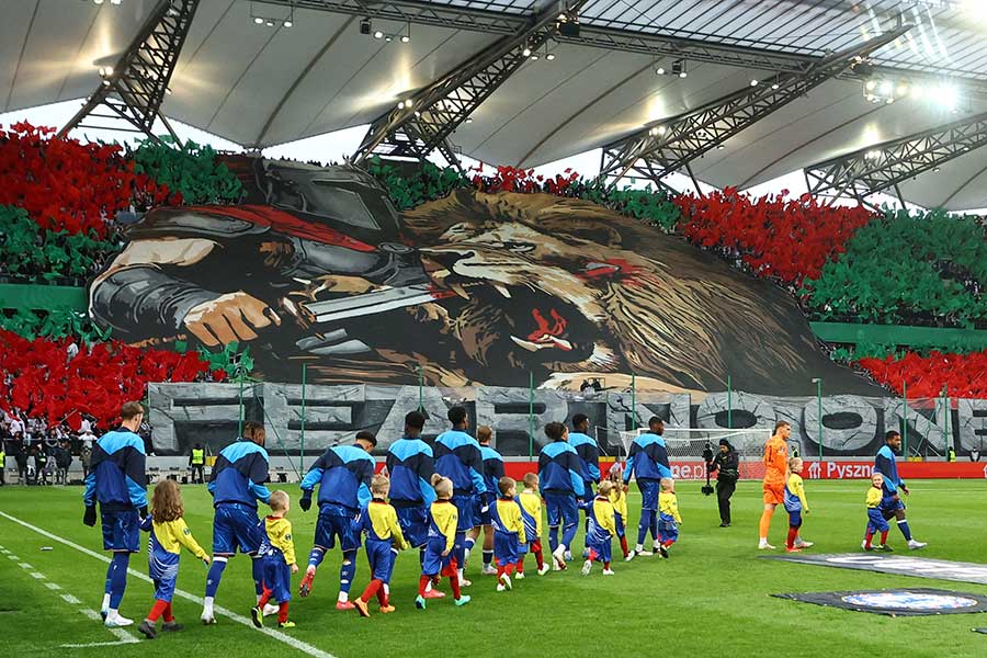 MF森下龍矢が所属するポーランド1部レギア・ワルシャワは現地時間4月10日にUEFAヨーロッパカンファレンスリーグ(ECL)の準々決勝第1戦でイングランド1部の強豪チェルシーと激突した。ホームで0-3と完敗を喫したなか、試合前にスタンドに掲げられた迫力満点のコレオグラフィーが話題となっている。