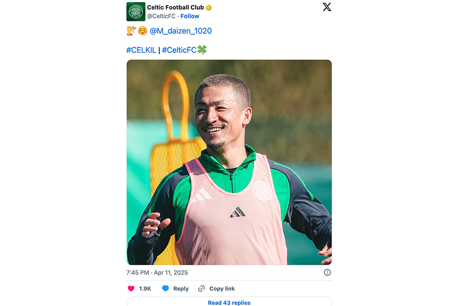スコットランド1部セルティックに所属する日本代表FW前田大然の髪型が話題を呼んでいる。現地時間11日にセルティックは公式X(旧ツイッター)を更新。最近は金髪で髪を伸ばしていた前田が、再び丸刈りに近い短髪となった写真を公開した。SNSのファンは「さらなる進化の予感!!」と反応している。