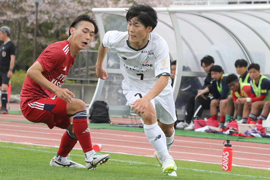 そして今年、彼は最高学年となった。流通経済大柏戦では彼らしいキレのあるドリブルは随所に見せた。本人が言うようにボールを触る機会は少なかったが、ボールを持てば相手が飛び込めそうで飛び込めない間合いにピタリとボールを置き、アクションをしてきたら裏街道やフェイントで逆を突き、してこなかったらシンプルに縦に仕掛けるなど駆け引きの妙は光った。