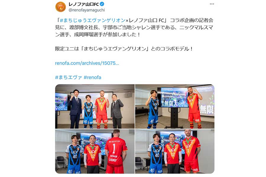 J2のレノファ山口は4月23日、人気アニメ「エヴァンゲリオン」とのコラボユニフォームを発表した。昨年に引き続きになるが、大きく変更したデザインに「良すぎるでしょ」「他サポだけど欲しい」と話題を呼んでいる。