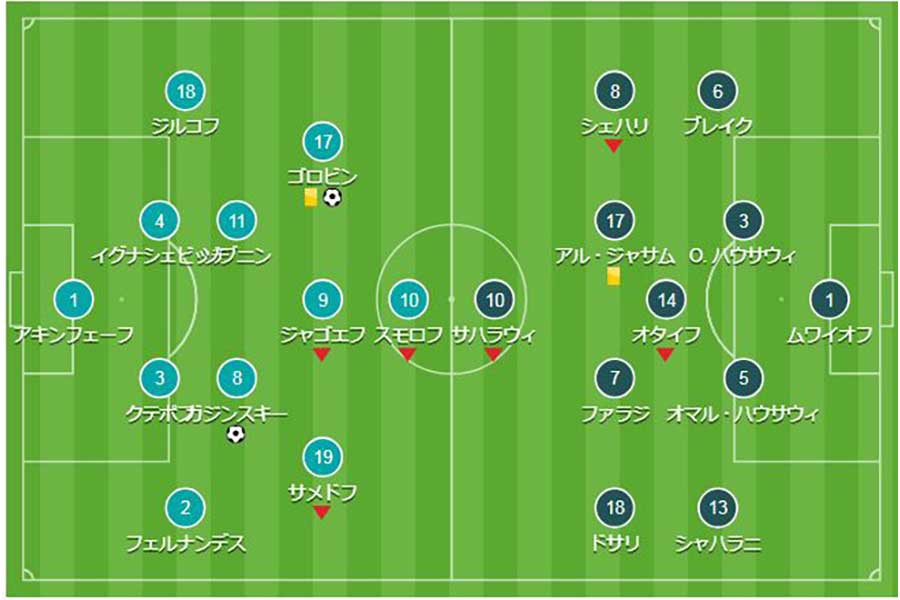 鍵を握るのはMFアレクサンダー・ゴロヴィンだ。後半アディショナルタイムにチーム5点目となる直接FKを右足で決めただけでなく、MFユーリ・ガジンスキーが決めた1点目とFWアテム・ジェバが決めた3点目のシーンでクロスを供給し2アシストも記録。チーム合計15本のクロスのうち成功は3本だが、そのすべてを通したのもまたゴロヴィンの右足だった。