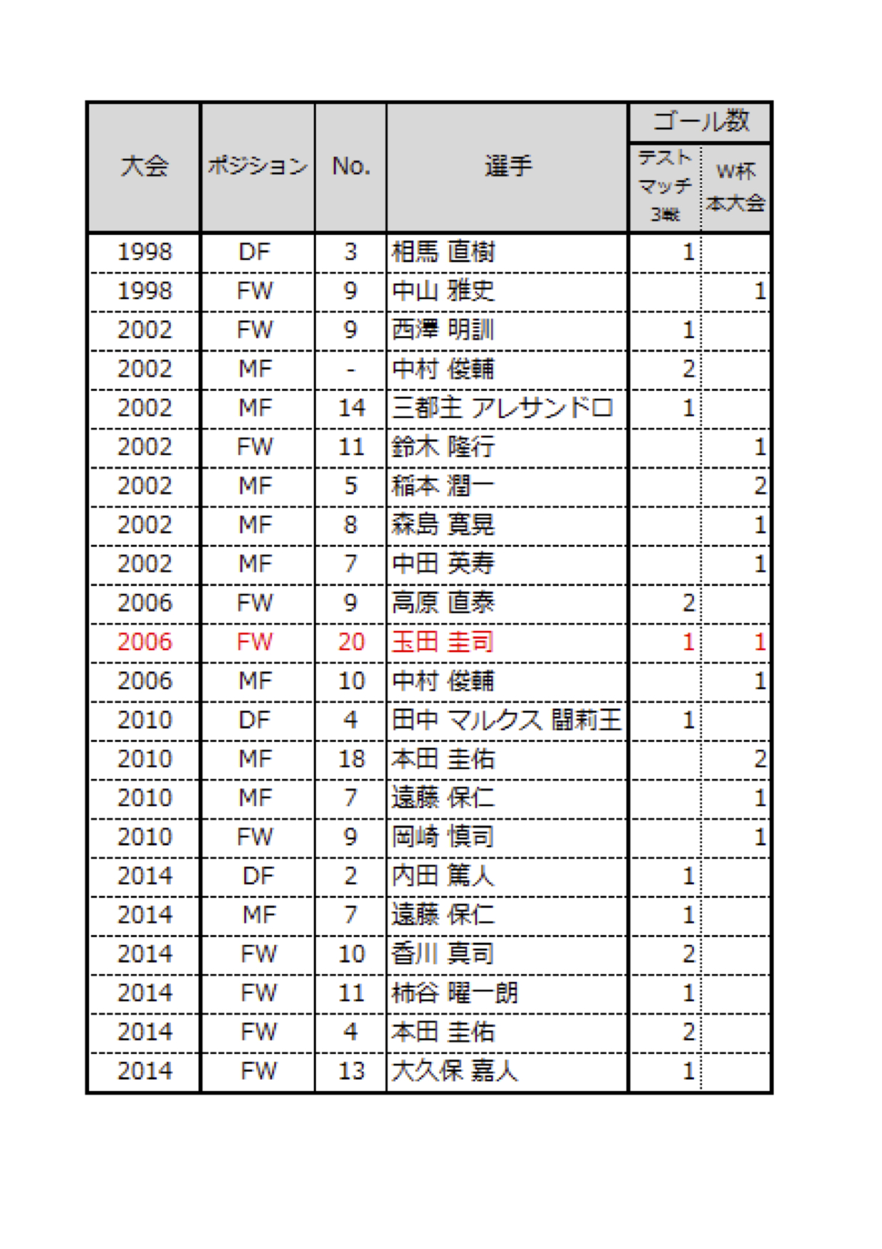ご覧いただければ分かるように、なんと直前のテストマッチ3戦でゴールを決めて、かつ本大会でもゴールを決めたのは、2006年大会の玉田圭司のみなのだ。逆に言うと、テストマッチ3戦でゴールを決めた選手は“ほぼ”本大会ではゴールを決められず、本大会でゴールを決めた選手は“ほぼ”テストマッチではゴールを決められなかった選手なのだ。