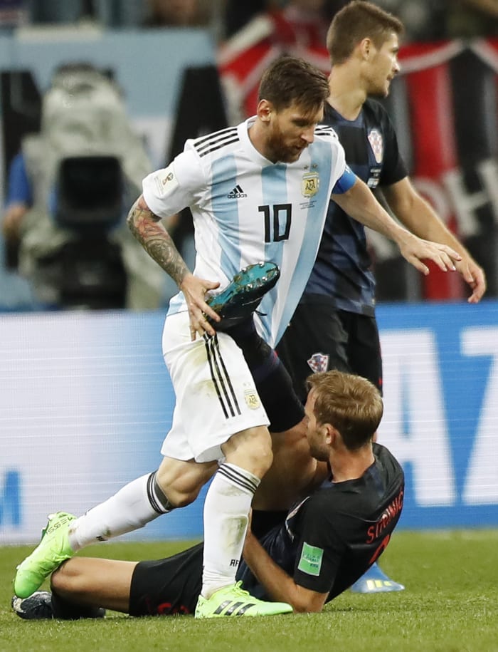 クロアチア戦でDFストリニッチの足を払いのけるメッシ【写真:AP】