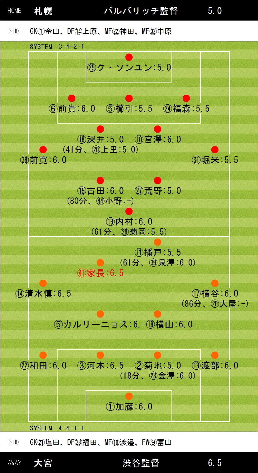 コンサドーレ札幌vs大宮アルディージャ2-3【14分:古田(札幌)、23分:前寛(札幌)、42分:家長(大宮)、60分:横谷(大宮)、75分:和田(大宮)】19時キックオフ、試合会場:札幌ド天候:屋内、入場者数:9,140人