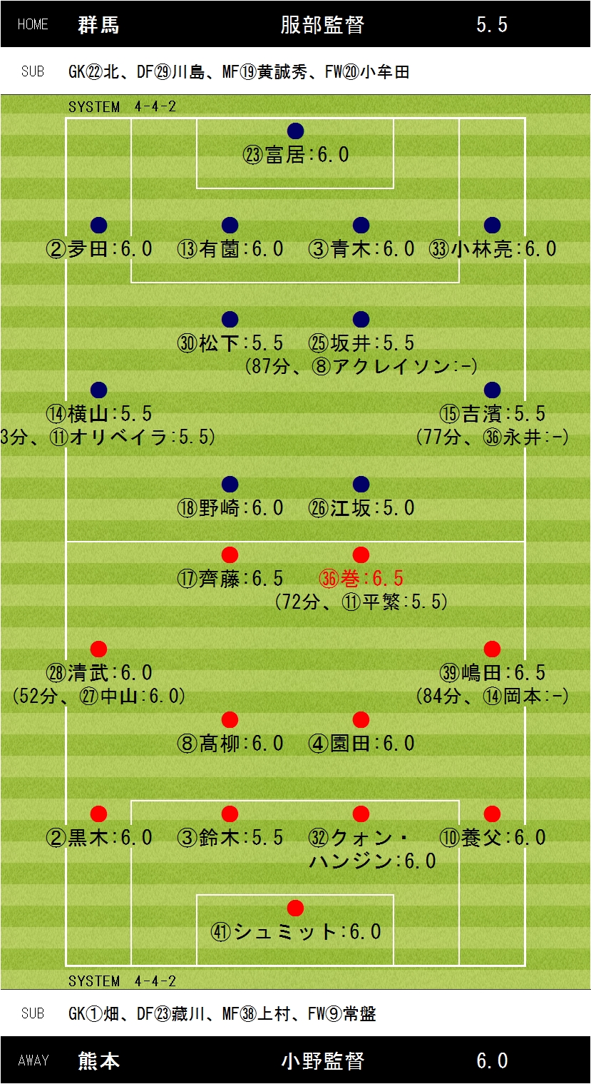 1-1【20分:野崎(群馬)、34分:巻(熊本)】