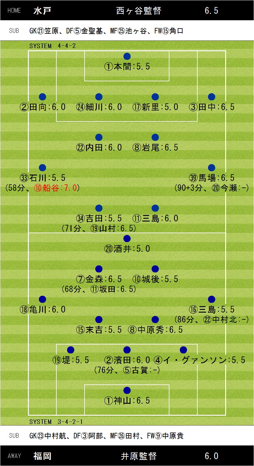 2-2【18分:金森(福岡)、73分:中原(福岡)、76分:馬場(福岡)、79分:山村(水戸)】