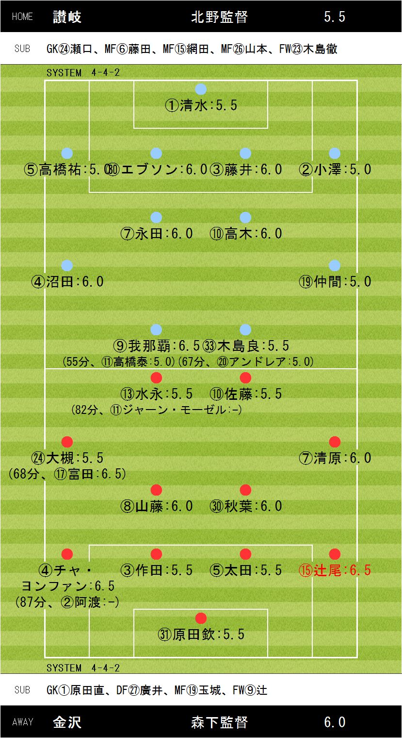 2-2【26分:高木(讃岐)、40分:チャ・ヨンファン(金沢)、52分:我那覇(讃岐)、76分:辻尾(金沢)】