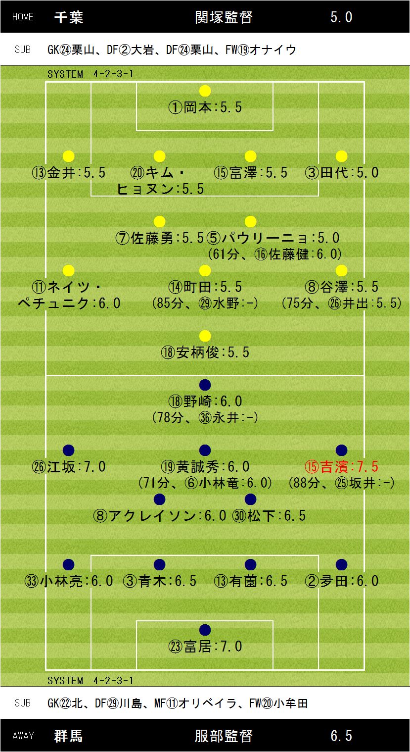 ジェフユナイテッド千葉vsザスパクサツ群馬1-2【32分:江坂(群馬)、63分:ネイツ・ペチュニク(千葉)、73分:吉濱(群馬)】19時キックオフ、試合会場:フクダ電子アリーナ天候:晴、入場者数:8,123人