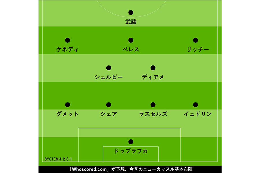 今オフ、武藤を獲得した一方で、セルビア代表FWアレクサンドル・ミトロヴィッチをフルハムに放出するなど攻撃陣の入れ替えが起きたニューカッスル。ラファエル・ベニテス監督の下で昨季10位に終わった古豪は、今季4-2-3-1のシステムで戦うと予想されている。