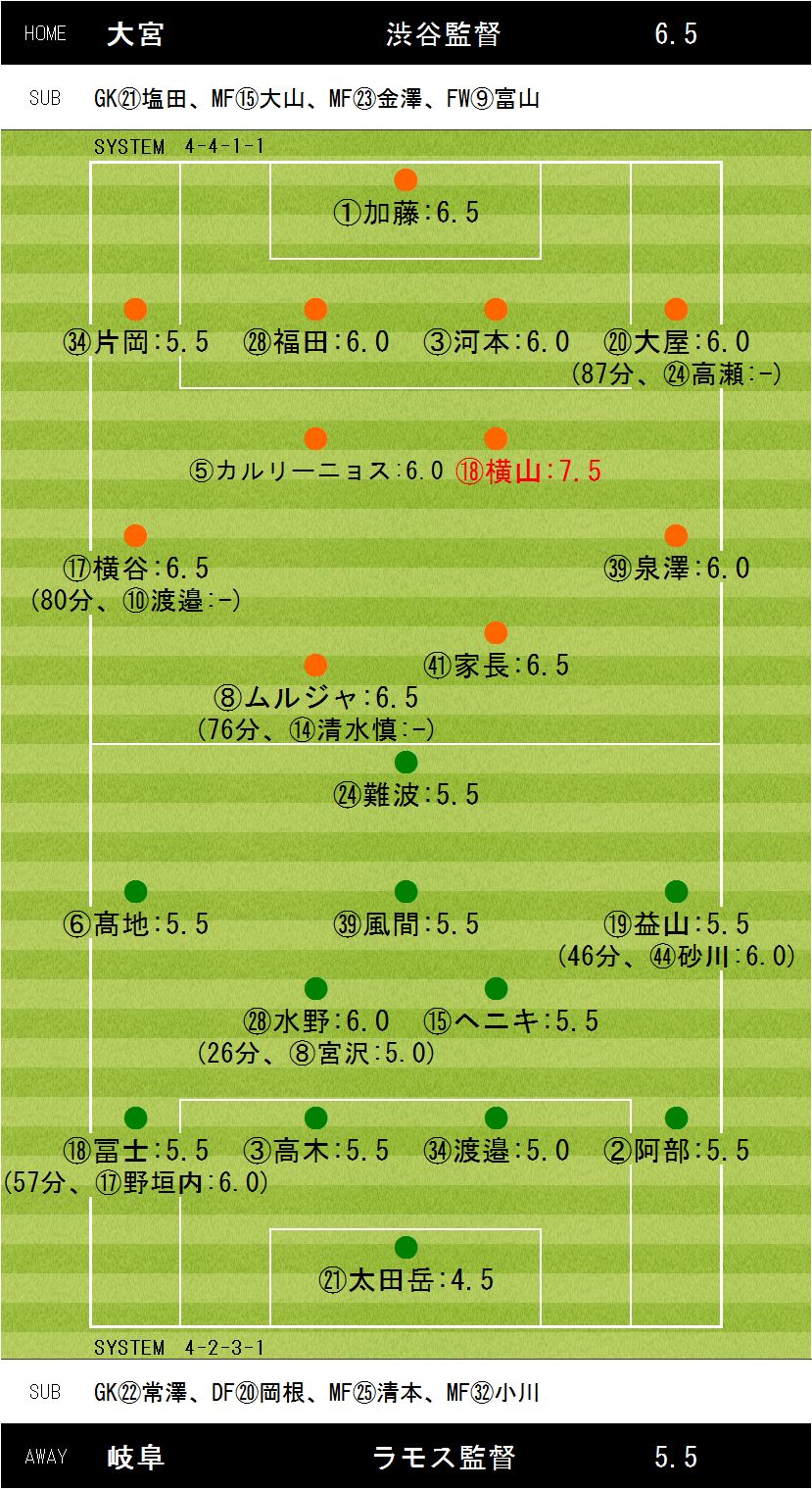 5-0【9分:横山(大宮)、42分:横山(大宮)、45分:ムルジャ(大宮)、75分:福田(大宮)、86分:家長(大宮)】