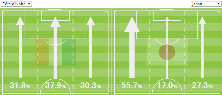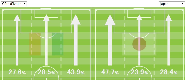 コートジボワールは右からの攻撃の比率が前半と比較して大きく増加した。守備に追われた状況下での攻撃参加は疲労を蓄積させる。そして香川は決して守備が得意な選手ではない。後半、日本が攻撃の起点を作っていた左サイドから多く攻められていたことが、データで示されている。