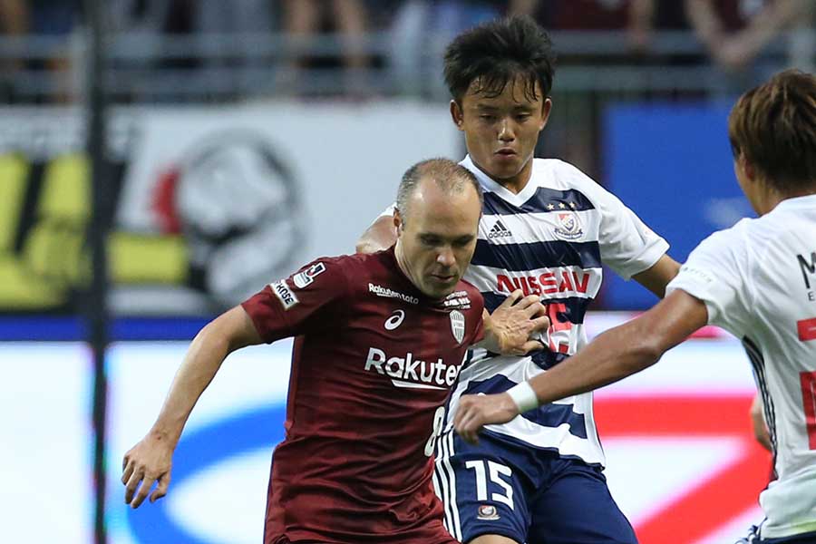 「イニエスタvs久保建英」――。26日に行われたJ1リーグ第24節、ヴィッセル神戸対横浜F・マリノスの一戦で実現したスペインの名門バルセロナの下部組織出身対決は、結果として移籍後初得点を挙げ、チームを2-0の勝利に導いた久保に軍配が上がったと言えるだろう。しかし、17歳は周囲の喧騒を沈めるかのように、「天と地の差がある」と肌で体感した“大先輩”について語った。