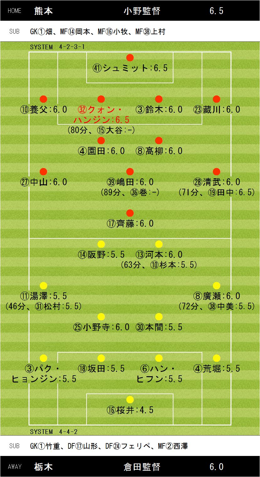 2−0【73分:クォン・ハンジン(熊本)、88分:嶋田(熊本)】
