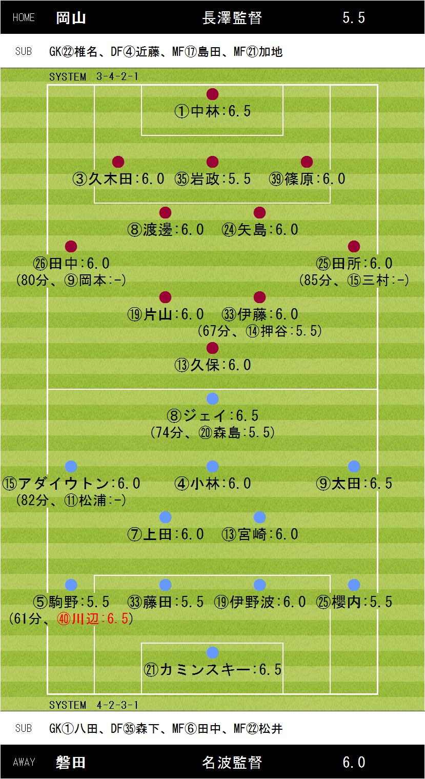 1−2【28分:岩政(岡山)、36分:ジェイ(磐田)、90+1分:川辺(磐田)】