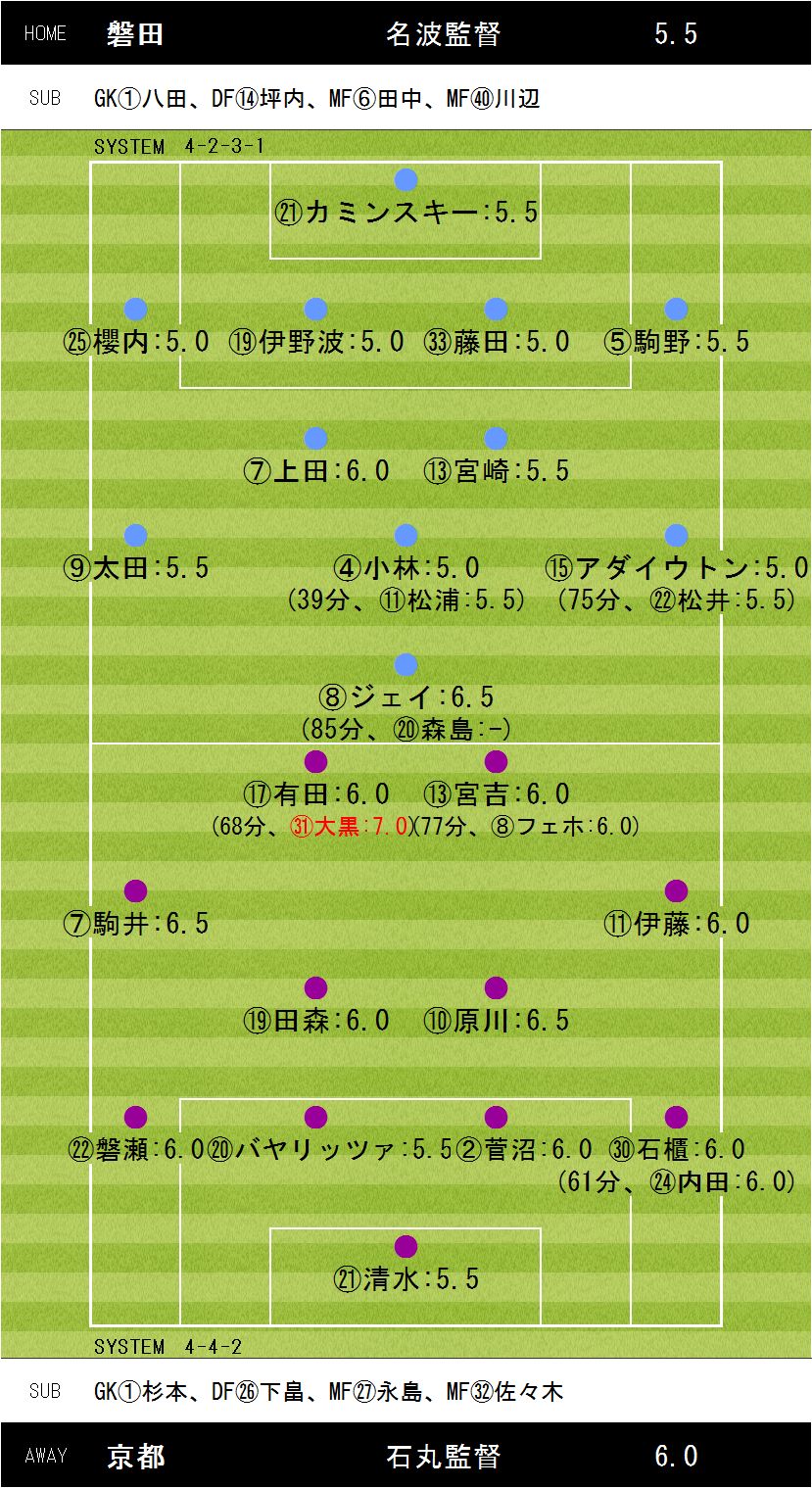 3−3【2分:ジェイ(磐田)、19分:宮吉(京都)、54分:ジェイ(磐田)、77分:大黒(京都)、79分:ジェイ(磐田)、85分:大黒(京都)】