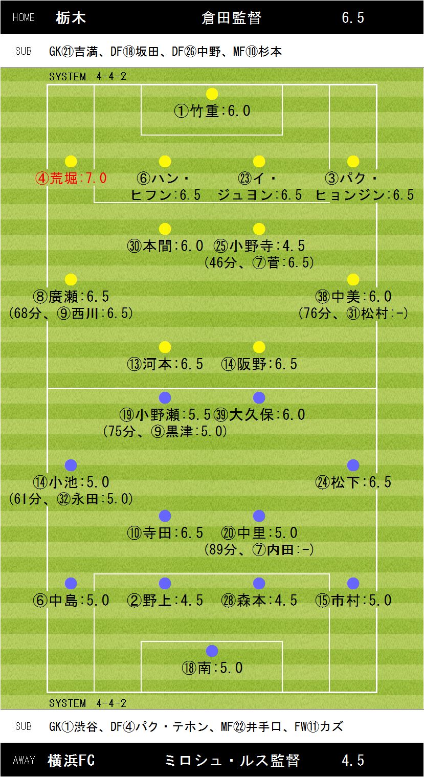 2-1【27分:荒堀(栃木)、35分:松下(横浜FC)、38分:河本(栃木)】