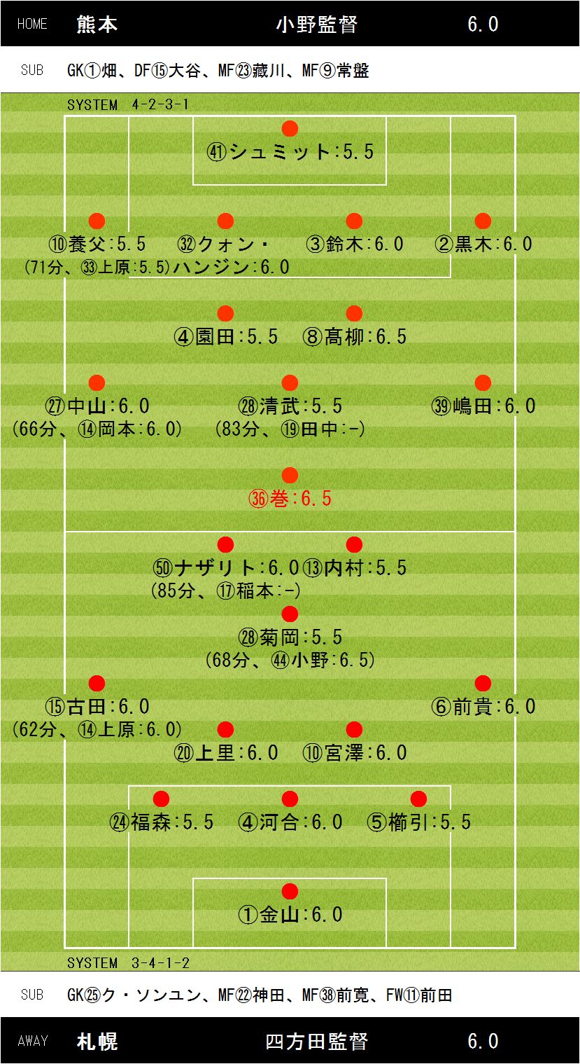 1−1【22分:前貴(札幌)、33分:巻(熊本)】