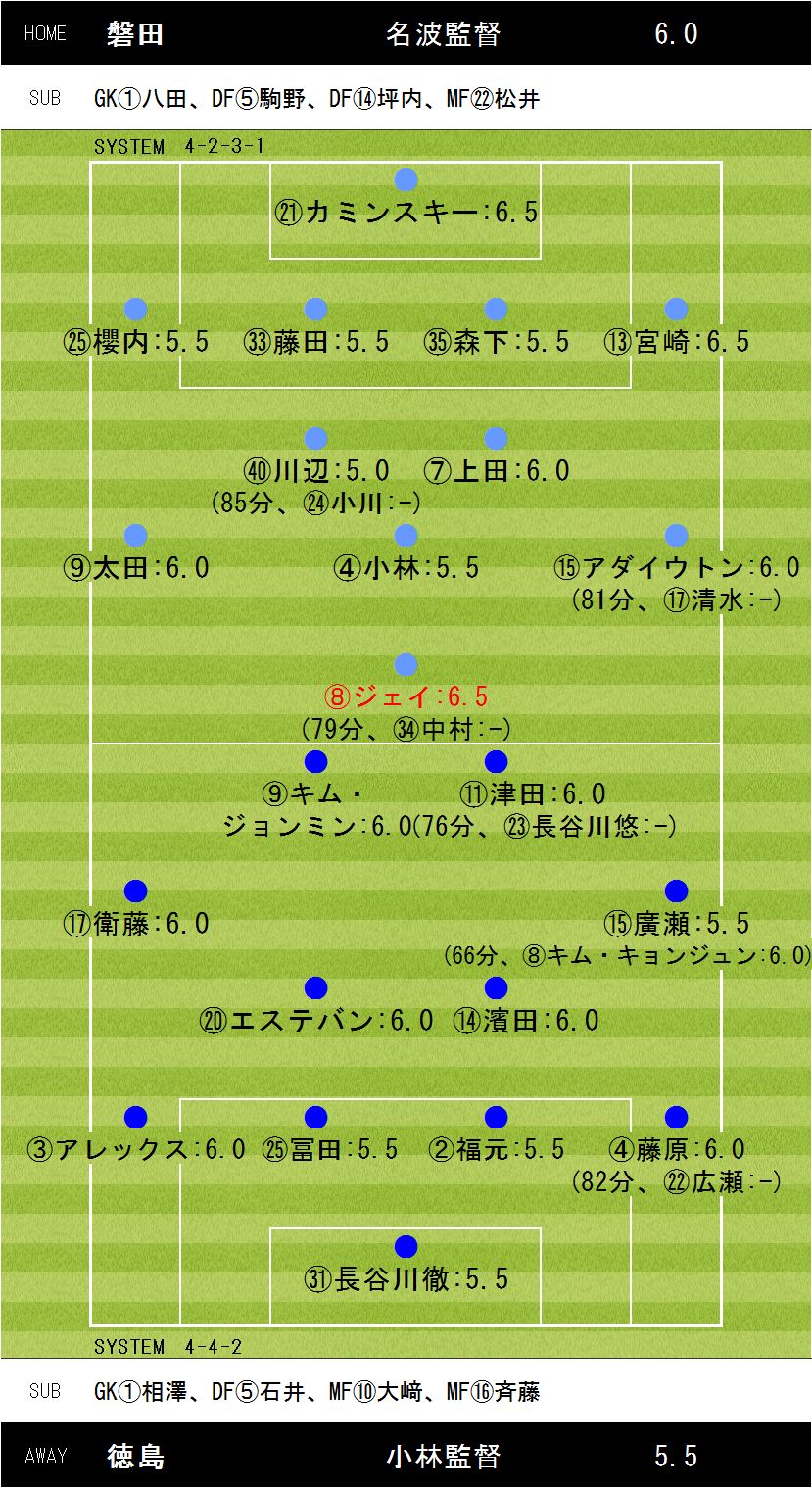 ジュビロ磐田vs徳島ヴォルティス3−1【52分:ジェイ(磐田)、58分:濱田(徳島)、59分:ジェイ(磐田)、75分:太田(磐田)】18時キックオフ 会場:ヤマハスタジアム天候:曇一時雨 入場者数:9,435人