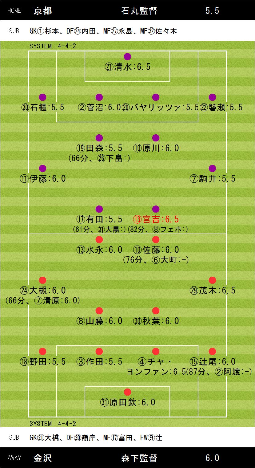 1−1【5分、チャ・ヨンファン(金沢)、48分:宮吉(京都)】