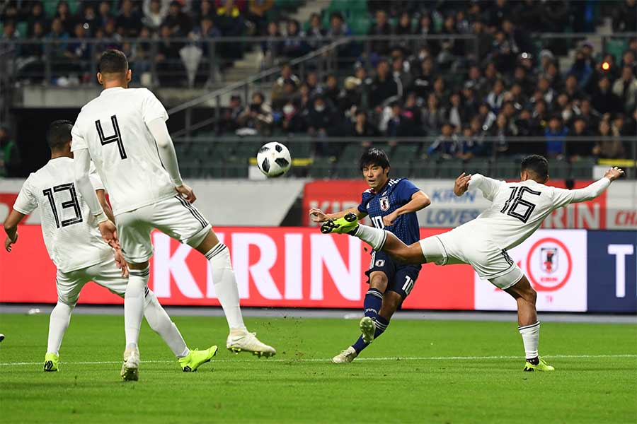 迎えた前半26分、中島の縦パスを起点にゴール前の大迫につなぎ、右サイドに展開。堂安は飛び出してきた相手GKの動きを見極め、利き足とは逆の右足でチップキック気味のシュートを狙ったが、ボールはわずかに左に逸れてゴールとはならなかった。