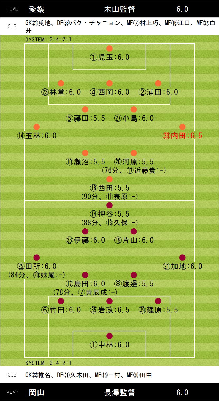 1−1【1分:伊藤(岡山)、41分:内田(愛媛)】