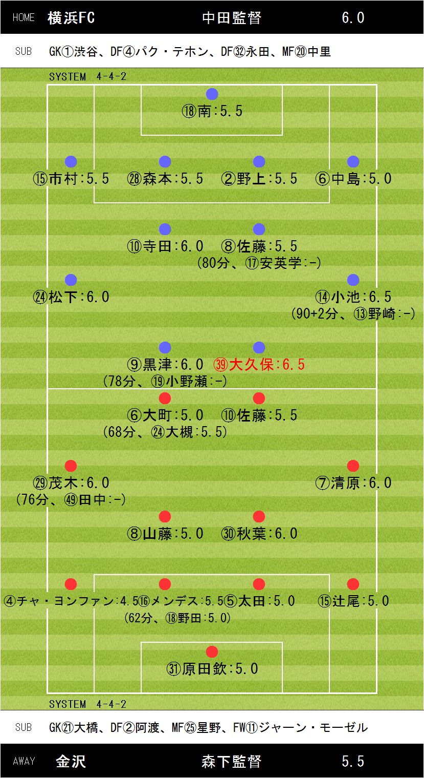 2−1【34分:大久保(横浜FC)、77分:黒津(横浜FC)、84分:清原(金沢)】