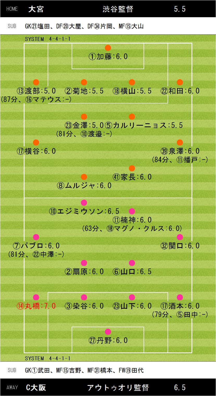 大宮アルディージャvsセレッソ大阪1−2【11分:エジミウソン(C大阪)、45分:ムルジャ(大宮)、75分:オウンゴール(C大阪)】18時キックオフ 会場:熊谷スポーツ文化公園陸上競技場天候:晴 入場者数:14,410人