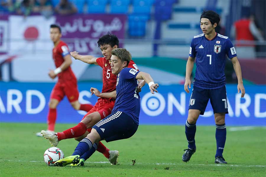 日本は1トップにFW北川航也を起用したほかは、決勝トーナメント1回戦サウジアラビア戦(1-0)と同じメンバーが並んだ。序盤からボール保持率を高める日本だが、守備時に5バックでスペースを埋めるベトナムの前になかなかゴール前へ切り込めない時間が続いた。