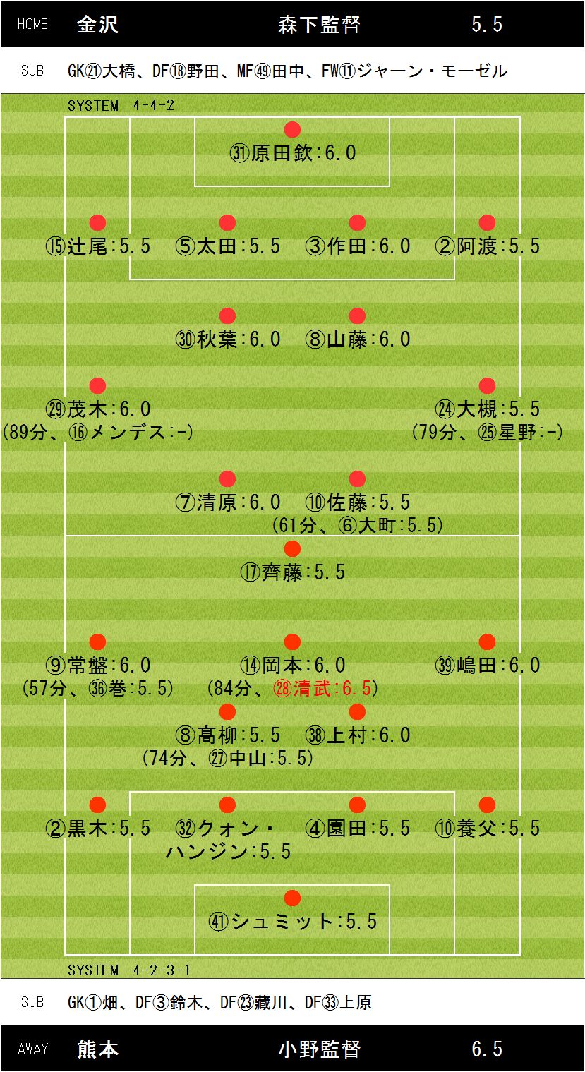 1−1【66分:作田(金沢)、90+2分:清武(熊本)】