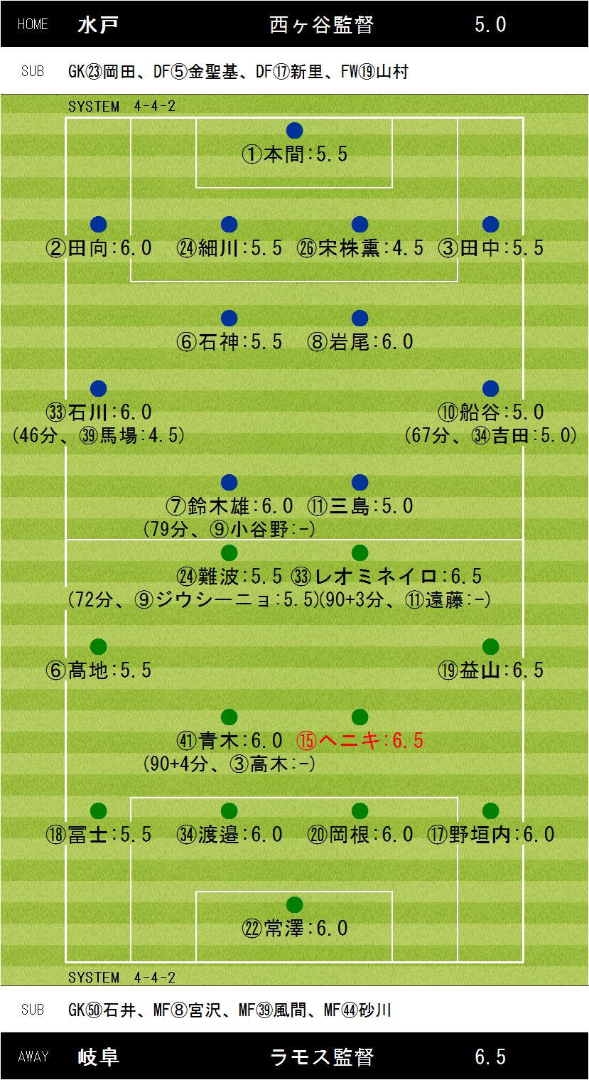0−2【54分:ヘニキ(岐阜)、65分:レオミネイロ(岐阜)】