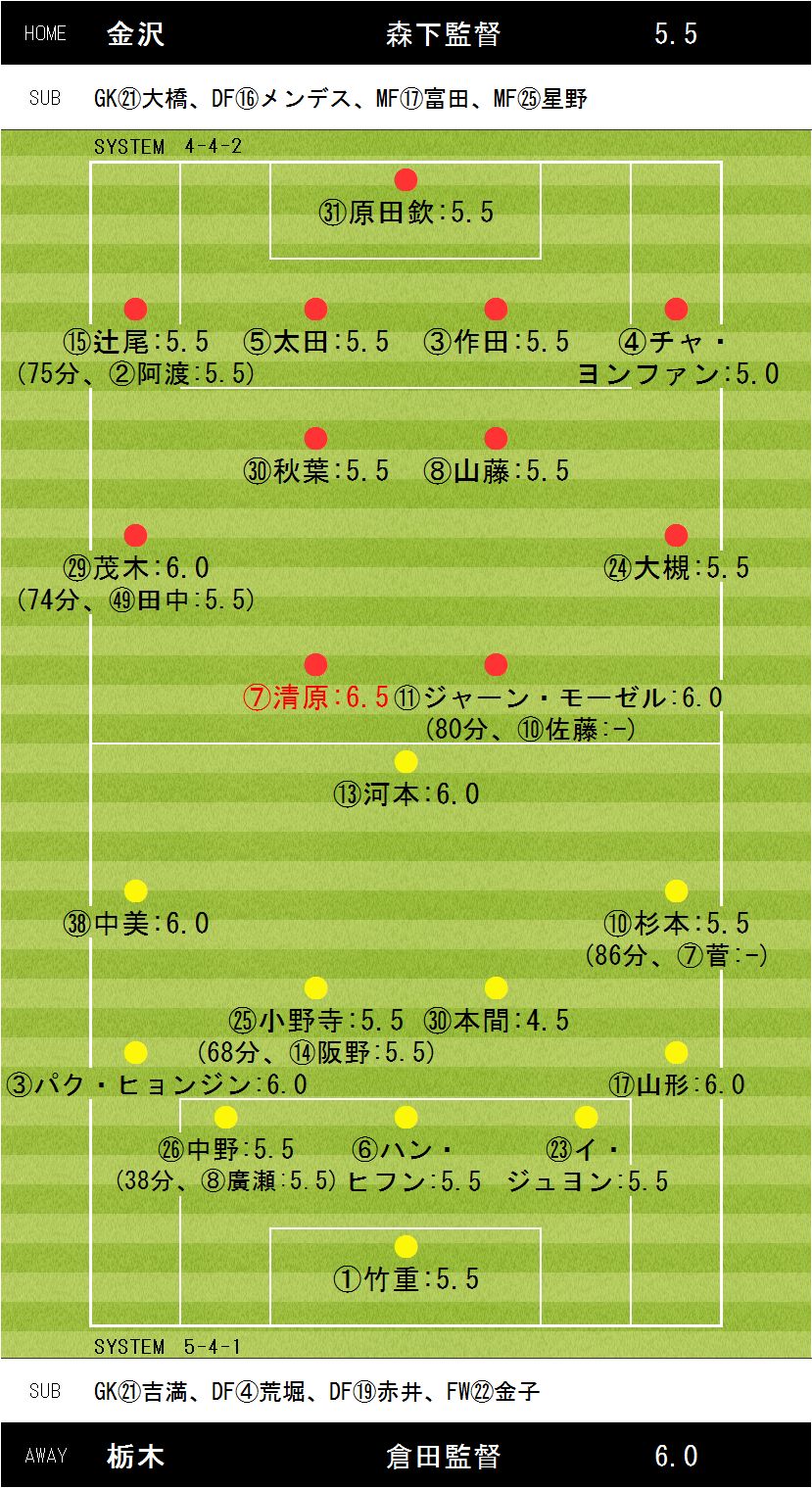 ツエーゲン金沢vs栃木SC2−2【25分:清原(金沢)、35分:清原(金沢)、71分:中美(栃木)、73分:河本(栃木)】13時キックオフ 会場:石川県西部緑地公園陸上競技場天候:晴 入場者数:3,217人