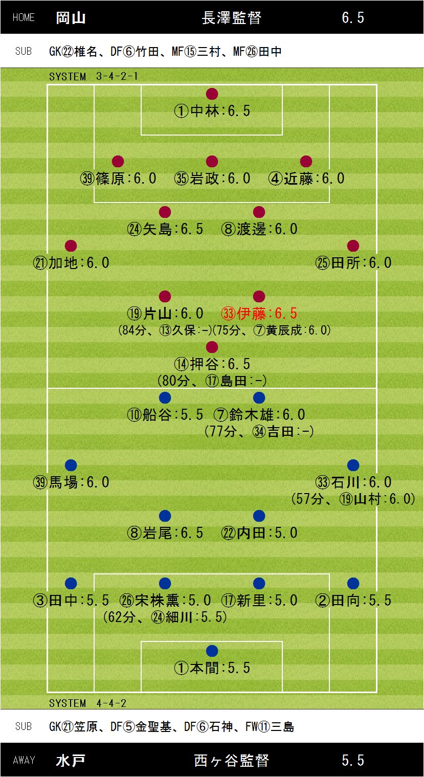 3−0【42分:矢島(岡山)、54分:押谷(岡山)、57分:押谷(岡山)】