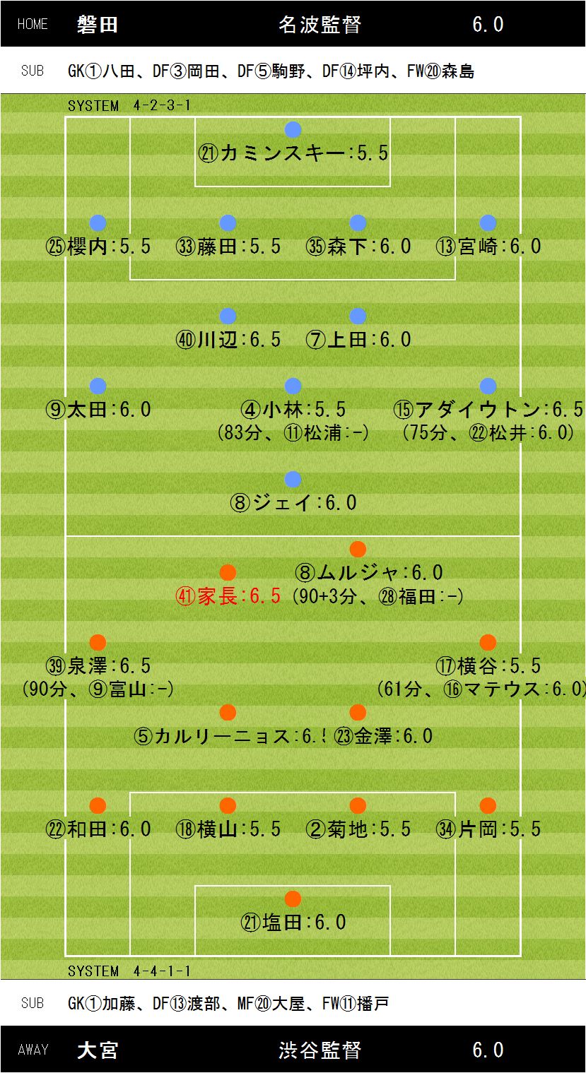 2−2【6分:アダイウトン(磐田)、21分:アダイウトン(磐田)、70分:家長(大宮)、81分:ムルジャ(大宮)】