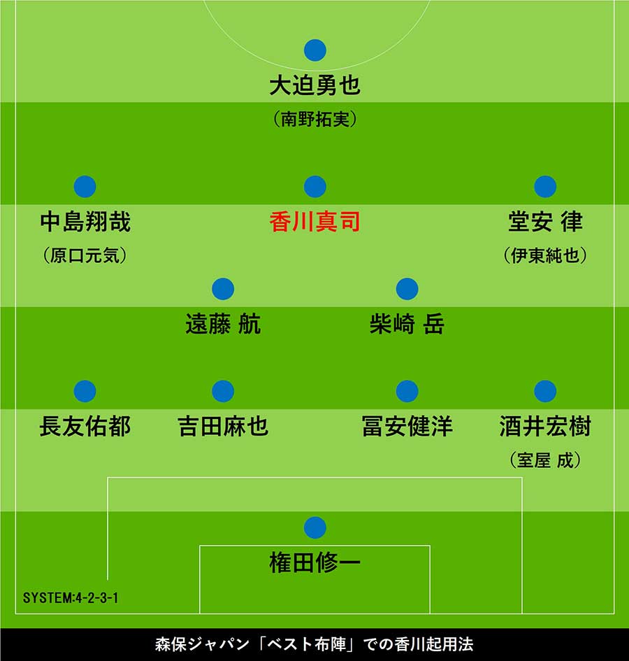【森保ジャパン「ベスト布陣」での起用法:4-2-3-1】香川起用を前提にアジアカップ準優勝メンバーと融合