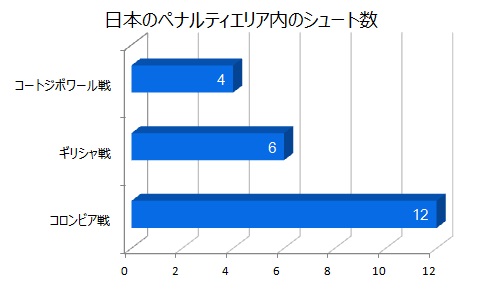 その結果、シュート数はコロンビアが13本であったのに対して25本、さらにペナルティエリア内だけに限定すると12本で、3試合の中では最も多くシュートを打っていたことが分かる。さらに、この試合での被ファール数は18回で、アタッキングサードでのそれは前半だけで3回。本田がFKを直接狙ってゴールを脅かす場面が何度もあるなど、敵陣の深くにおいてボールを回してチャンスを作っていたといえるだろう。試合を通して健闘したと感じられた印象は、数字にも残っている。