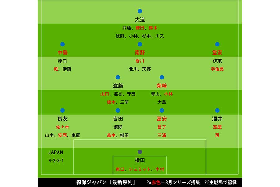 依然として酒井の壁は厚い。3月シリーズでは招集が見送られたが、その座は変わらず不動だ。室屋はコンスタントに招集されていることからも、バックアッパーとしては評価を得ている。酒井を脅かすためには、クロスの精度や1対1のバリエーションなど、フィニッシュを演出するプレーを磨きたい。ボリビア戦で7年ぶりの代表キャップを刻んだ西は、危機察知能力や状況判断は優れており、室屋の対抗馬候補だが、31歳という年齢がネックか。初陣で右SBに入った守田は、基本は主戦場のボランチで勝負となりそうだ。